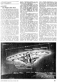 Curiosamente il disegno e la situazione descritta era molto simile ad un'illustrazione comparsa sul numero di luglio 1943 della rivista americana di fantascienza "Amazing Stories": con un e vero e proprio anacronismo, essa ritraeva un classico disco volante, dotato di cupola, che sparava raggi luminosi contro un gruppo di bombardieri in volo! Gli articoli che apparvero sulla stampa tedesca nella primavera del 1950 (e negli anni successivi, come la copertina a colori del tabloid "ZB Illustrierte"[31], che presentava un disco volante al di sopra di un gruppo di soldati tedeschi) erano permeati da una vena di patriottismo: i tedeschi erano gli inventori della meraviglia tecnologica di quei dischi volanti che volavano indisturbati nei cieli di tutto il mondo.